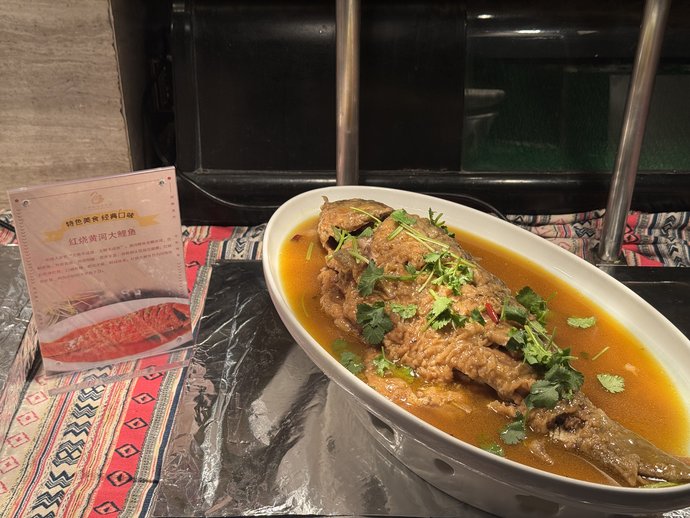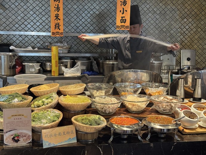 一口老味道,半部中原史。“这条红烧黄河大鲤鱼,吃出了母亲河的气魄!”站在美食专区前,一位台湾嘉宾动情地说道。专区现场,这些带有简介菜笺“会说话的老家菜”让嘉宾发出感慨:“食物成了最鲜活的历史教科书。”在明档区,一场“中原面魂”盛宴正在上演。嘉宾们手持面团,在主厨指导下体验“三揉三醒”技艺。面团经伸展拉成细丝后,投入羊骨熬制的雪白浓汤。一位嘉宾说:“这碗面勾起了我小时候在国棉厂陪伴妈妈下班时的味道。”