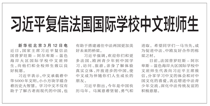 习近平复信法国国际学校中文班师生