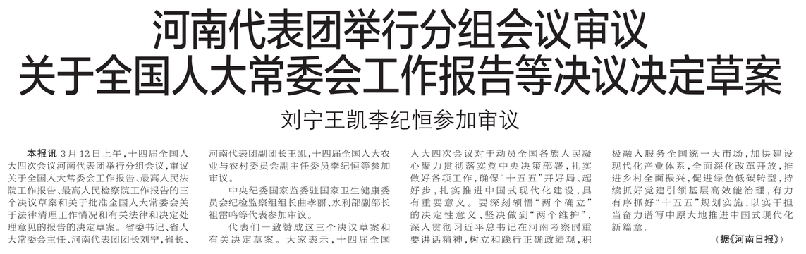 3月12日上午,十四届全国人大四次会议河南代表团举行分组会议,审议关于全国人大常委会工作报告、最高人民法院工作报告、最高人民检察院工作报告的三个决议草案和关于批准全国人大常委会关于法律清理工作情况和有关法律和决定处理意见的报告的决定草案。省委书记、省人大常委会主任、河南代表团团长刘宁,省长、河南代表团副团长王凯,十四届全国人大农业与农村委员会副主任委员李纪恒等参加审议。(今日《郑州日报》1版)