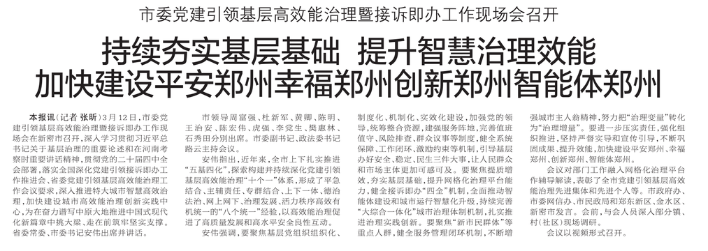 3月12日,市委党建引领基层高效能治理暨接诉即办工作现场会在新密市召开,深入学习贯彻习近平总书记关于基层治理的重要论述和在河南考察时重要讲话精神,贯彻党的二十届四中全会部署,落实全国深化党建引领接诉即办工作推进会、省委党建引领基层高效能治理工作会议要求,深入推进特大城市智慧高效治理,加快建设城市高效能治理创新实践中心,为在奋力谱写中原大地推进中国式现代化新篇章中挑大梁、走在前筑牢坚实支撑。省委常委、市委书记安伟出席并讲话。