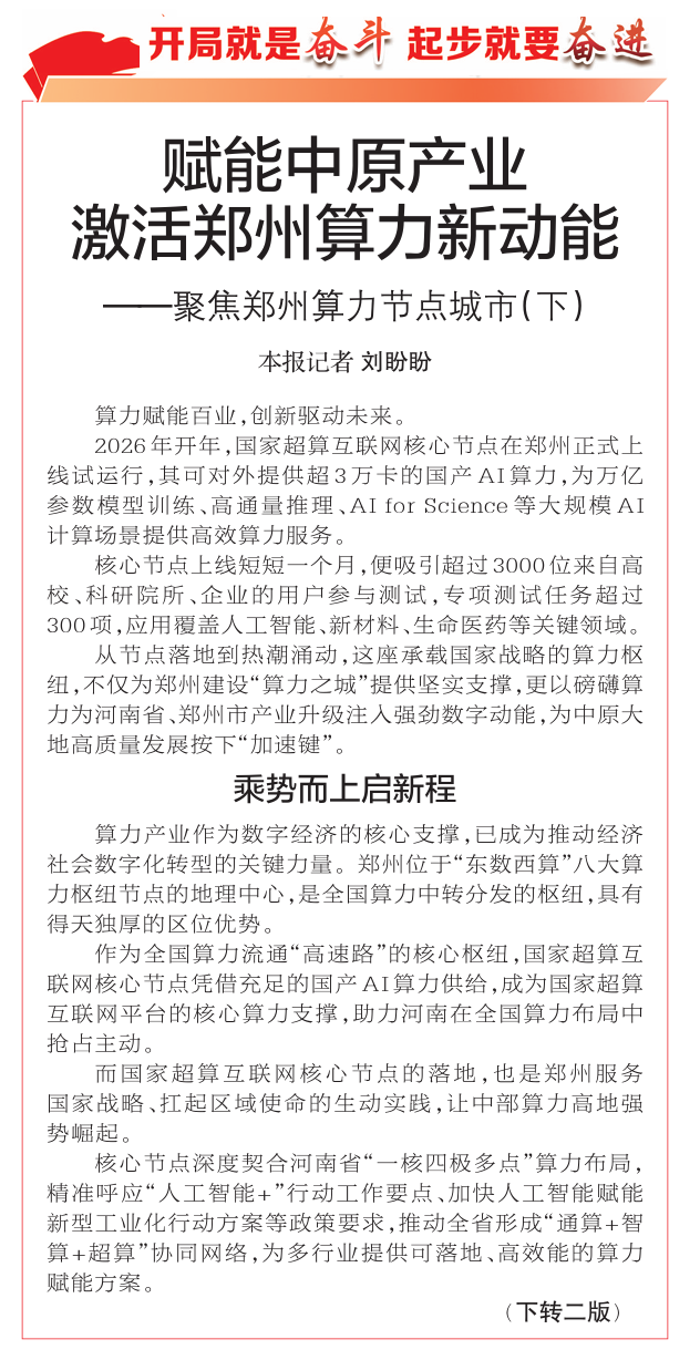 2026年开年,国家超算互联网核心节点在郑州正式上线试运行,其可对外提供超3万卡的国产AI算力,为万亿参数模型训练、高通量推理、AI for Science等大规模AI计算场景提供高效算力服务。(今日《郑州日报》1版、2版)