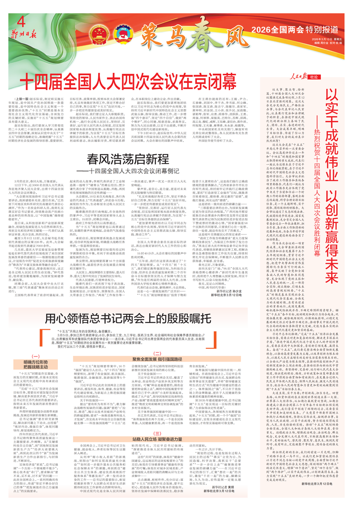 第十四届全国人民代表大会第四次会议在圆满完成各项议程后,12日下午在北京人民大会堂闭幕。大会批准政府工作报告、“十五五”规划纲要、全国人大常委会工作报告等。大会通过生态环境法典、民族团结进步促进法、国家发展规划法、关于批准全国人大常委会关于法律清理工作情况和有关法律和决定处理意见的报告的决定,国家主席习近平签署第70号、第71号、第72号、第73号主席令。