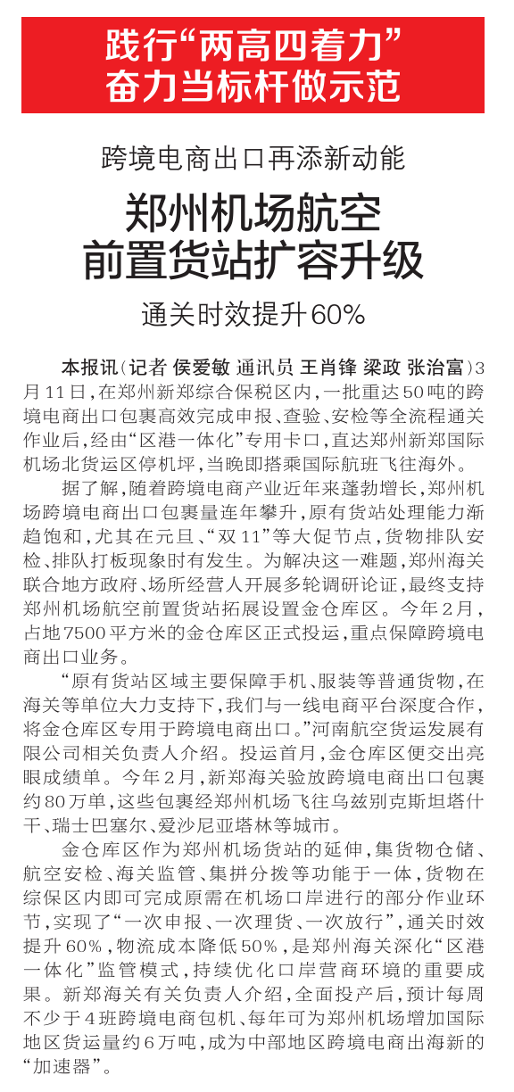 3月11日,在郑州新郑综合保税区内,一批重达50吨的跨境电商出口包裹高效完成申报、查验、安检等全流程通关作业后,经由“区港一体化”专用卡口,直达郑州新郑国际机场北货运区停机坪,当晚即搭乘国际航班飞往海外。(今日《郑州日报》2版)