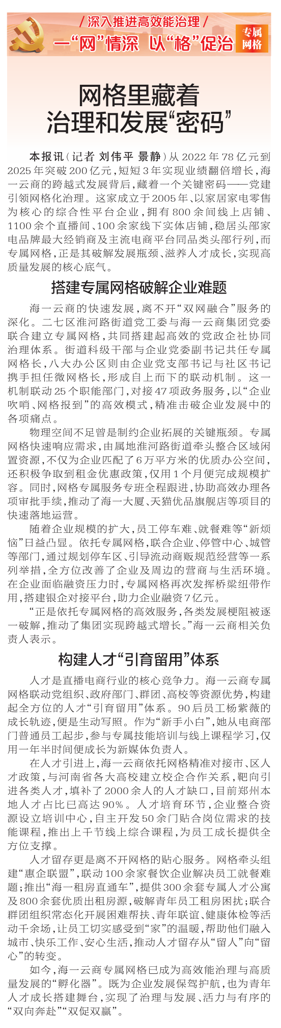 从2022年78亿元到2025年突破200亿元,短短3年实现业绩翻倍增长,海一云商的跨越式发展背后,藏着一个关键密码——党建引领网格化治理。这家成立于2005年、以家居家电零售为核心的综合性平台企业,拥有800余间线上店铺、1100余个直播间、100余家线下实体店铺,稳居头部家电品牌最大经销商及主流电商平台同品类头部行列,而专属网格,正是其破解发展瓶颈、滋养人才成长,实现高质量发展的核心底气。(今日《郑州日报》2版)