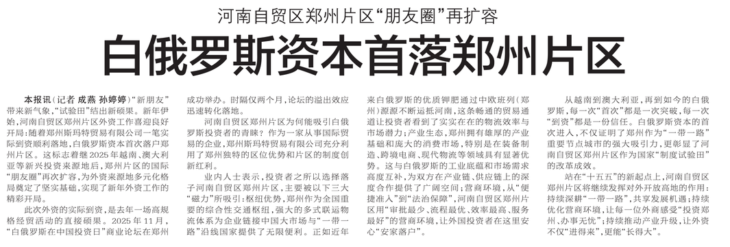 “新朋友”带来新气象,“试验田”结出新硕果。新年伊始,河南自贸区郑州片区外资工作喜迎良好开局:随着郑州斯玛特贸易有限公司一笔实际到资顺利落地,白俄罗斯资本首次落户郑州片区。这标志着继2025年越南、澳大利亚等新兴投资来源地后,郑州片区的国际“朋友圈”再次扩容,为外资来源地多元化格局奠定了坚实基础,实现了新年外资工作的精彩开局。(今日《郑州日报》6版)