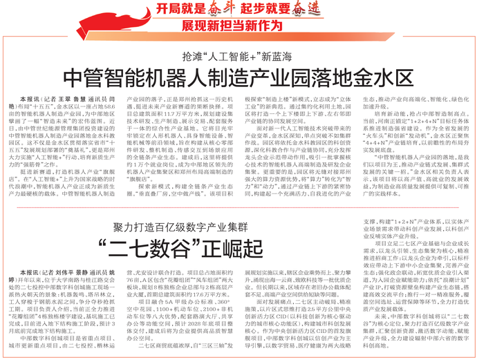布局“十五五”,金水区以一座占地58.6亩的智能机器人制造产业园,为中部地区擘画了一幅“智造未来”的宏伟蓝图。近日,由中管世纪能源管理集团投资建设的中管智能机器人制造产业园落地金水科教园区。这不仅是金水区贯彻落实省市“十五五”发展规划部署的“奠基礼”,更是郑州大力实施“人工智能+”行动、培育新质生产力的“强筋骨”之作。(今日《郑州日报》7版)